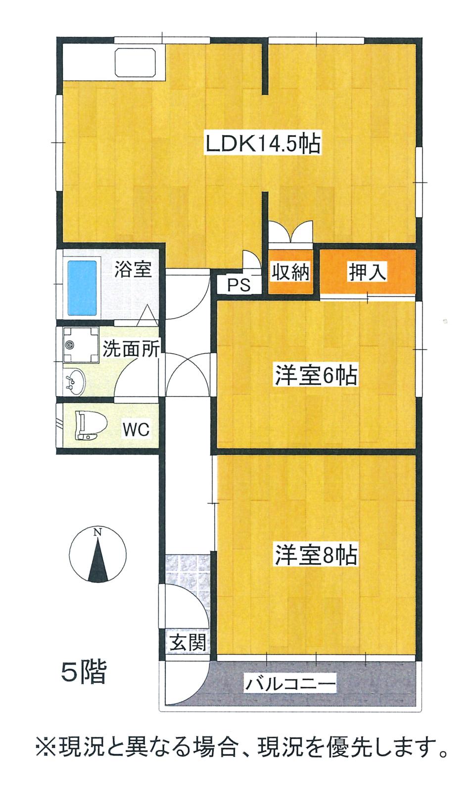 部屋階数 5階 間取り 2LDK 間取り内訳 洋室6.0帖/洋室8.0帖/LDK14.5帖 バルコニー 南向き